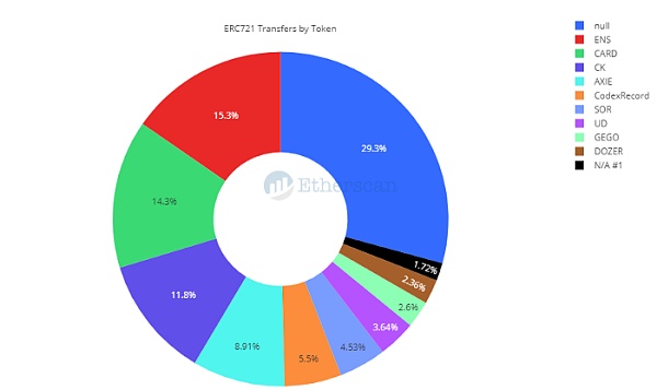 其中 71% 是由 10 大代幣完成的,包括游戲代幣(Cryptokitties、Gods Unchained、Axie Infinity、Sorare & Dozer 占約 42%)和域名(ENS & Unstoppable Domains 占約 19%)。