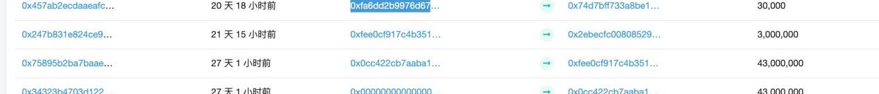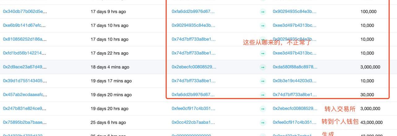 可以看到,上圖記錄中,合約創建后產生了4300萬枚HJL,轉賬到0xfee0c開頭地址,接著該地址轉入0x2ebecf開頭地址,接著我們看到了0xfa6dd2開頭地址的轉賬,顯然這個地址此前并未獲得官方創建的相關Token。