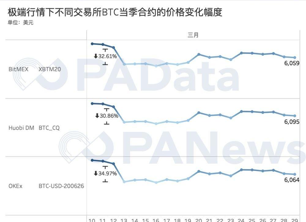 BTC當季合約是除了BTC永續合約以外,市場上最大的交割合約,12日至13日,Huobi的BTC當季合約跌了30.84%,BitMEX跌了32.61%,OKEx跌了34.97%。值得注意的是,當季合約在極端行情下的合約價格波動普遍高于永續合約。幣安暫無當季合約,因此未納入統計。