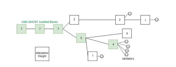 在以太坊中,最長鏈由算力決定,而以太坊2.0的信標鏈則使用POS算法。因此,將需要一套不同的規則來確定每個人都需要遵循的分叉鏈(注:即主鏈)。信標鏈通過使用LMD GHOST(Latest Message Driven GHOST)來解決此問題。此方法涉及一種基于消息或換句話說通過投票運行的算法。一般來說,票數最高的分叉鏈將被視為主鏈。