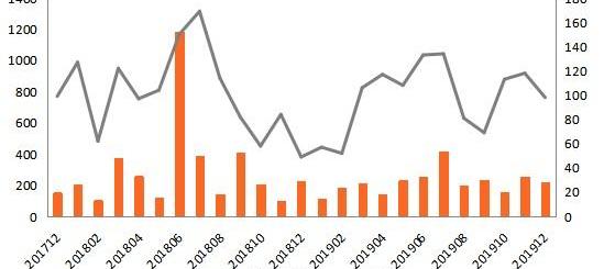 XRP/HKD-0.62%2019年,零壹金融科技投融資指數在6月達到全年最高值180,3月為次高點179,此后在160上下波動,12月最新指數為151。