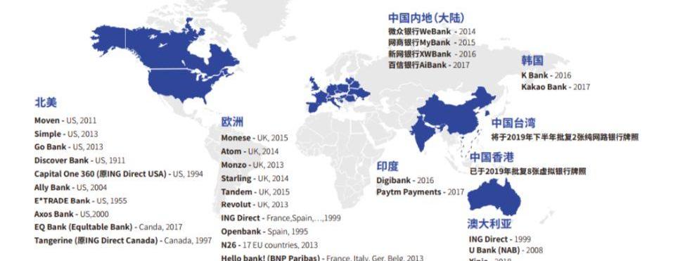 綜上所述,可以看出數字銀行這一新興業態,將成為未來幾年全球銀行業變革創新的重要風向標。此前微眾銀行在2019年發布的《決戰數字之巔——2019全球數字銀行報告》中提出,據不完全統計,全球多地數字銀行布局情況如下: