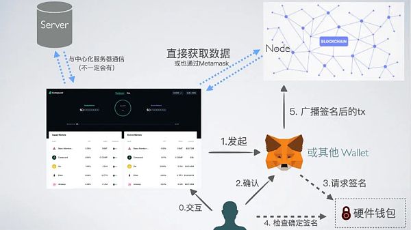 當你直接使用 Metamask 存儲私鑰完成簽名時,實際是沒有3、4步驟的。但這樣對于較大資金而言是不夠安全的,Metamask 應當只是一個橋梁,私鑰保管授權的角色應該交給更專業的硬件錢包來進行。