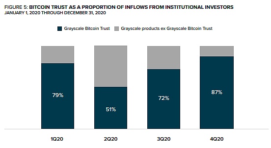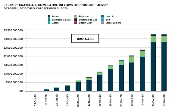 Grayscale在第四季度共流入了33億美元,使2020全年的流入資金達到57億美元。