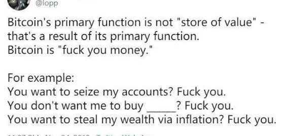 然而有趣的是,比特幣在發布之初的目的就是為了擺脫中央銀行濫發貨幣導致人們財產的貶值,本質上就是一場無政府主義實驗。中本聰將比特幣設計成為總量恒定且永不增發的系統,終極目的可能是這樣一種理想主義:實現超越資本主義的價值體系。正如比特幣的核心開發者之一JamesonLopp最近在推特上發表的言論:比特幣的首要功能并不是儲存價值,那只是其首要功能的結果之一。你無法奪走我的賬戶,你無法讓我不買什么東西,你無法通過通脹盜取我的財產。
