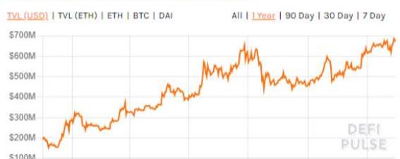 以太坊是整個DeFi世界中最大的支柱。DeFiPulse的數據顯示,DeFi在系統中鎖定了多達270萬以太幣,占總ETH供應量的2.5%。僅Maker一家就持有至少3.25億美元的DeFi,約占DeFi鎖定量的一半。