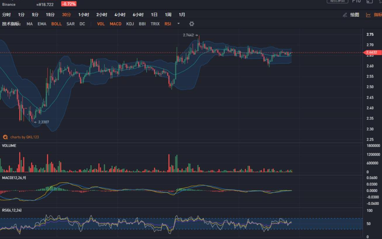 昨日至今,EOS縮量下探至2.6美元之后小幅拉升,繼續呈縮量震蕩,短時變盤風險較大。