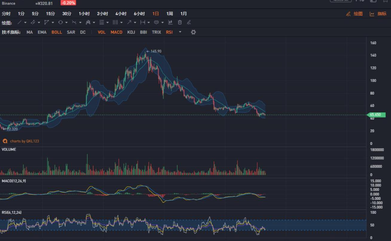 相對BTC,LTC的表現明顯弱勢,目前在45美元縮量震蕩,短時弱勢聯動BTC。