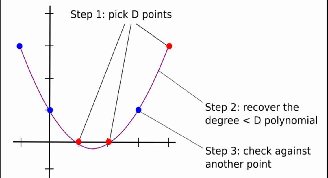 至此,問題就轉化成了,Alice宣稱“多項式等式在變量x取值范圍內成立”的問題。那么驗證者Bob該如何驗證呢?具體過程如下: