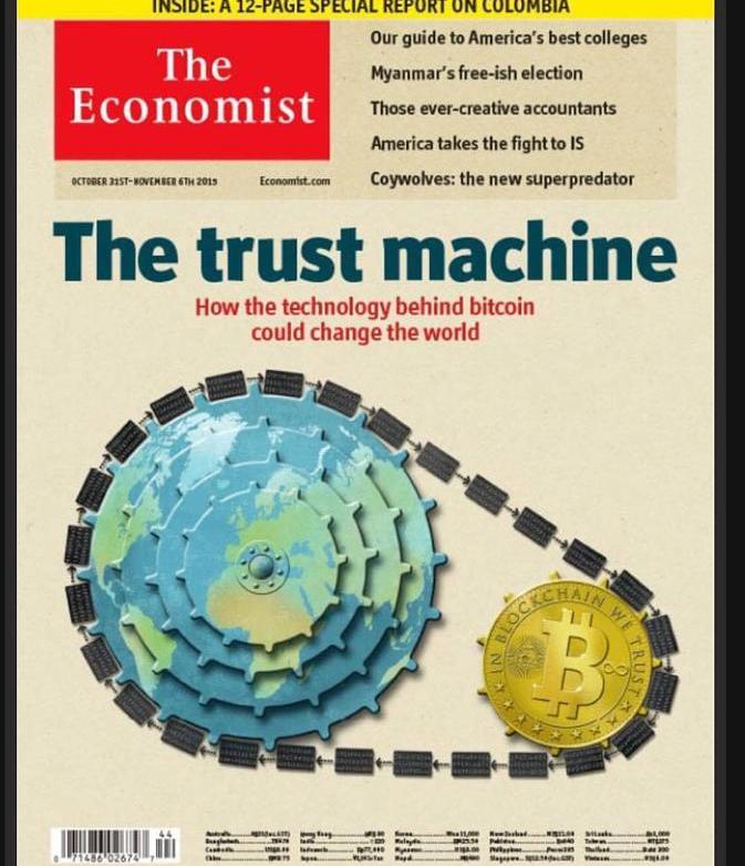 最具代表的事件是此年10月31日《經濟學人》的封面文章《信任的機器》。此后,區塊鏈這一新鮮概念遍地開花,橫沖直撞地向全世界撲來。