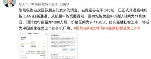 今日午間,雪球區塊鏈分析師鄶冬發微博表示:“剛剛收到老虎證券朋友們發來的消息,老虎證券在半小時前,已正式開通嘉楠耘智(CAN)打新通道。從新股申購頁面得知,嘉楠耘智美股IPO確認時間為11月20日,預計發行數量為1000萬股,價格區間為9~11USD。此次嘉楠耘智上市,將成為中國首家在美上市的礦機廠商。”