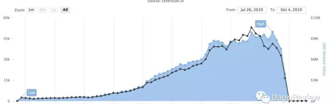 FairWin的第一輪從6月18號開始,中間在7月底因合約漏洞風險替換了一次新合約,最終于UTC時間9月30日晚崩盤,合約余額歸零。