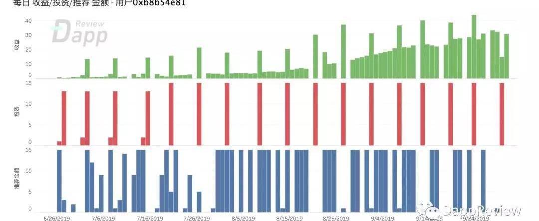 但實際上,我們可以看到B哥在6月26和6月27號前兩次投資一共14ETH,在五天資金解凍后,B哥只是用解凍資金繼續復投,這一次復投總計15ETH,達到了VIP3的上限。從此之后,每隔5天取出本金15ETH,立即進行復投。