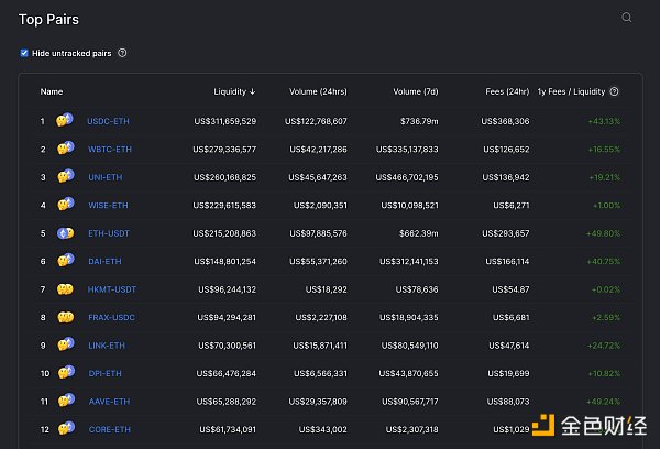 此外,通過查看uniswap上的交易對交易量排名,也可以發現端倪。足以看到重要代幣的交易對的重要性。