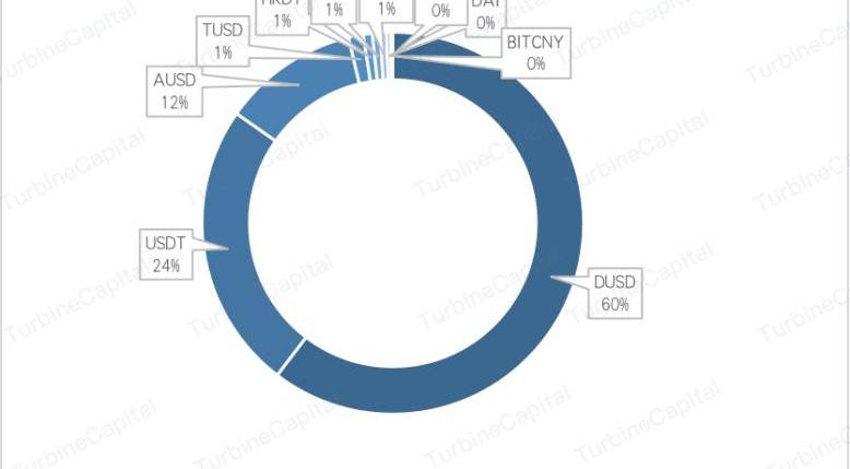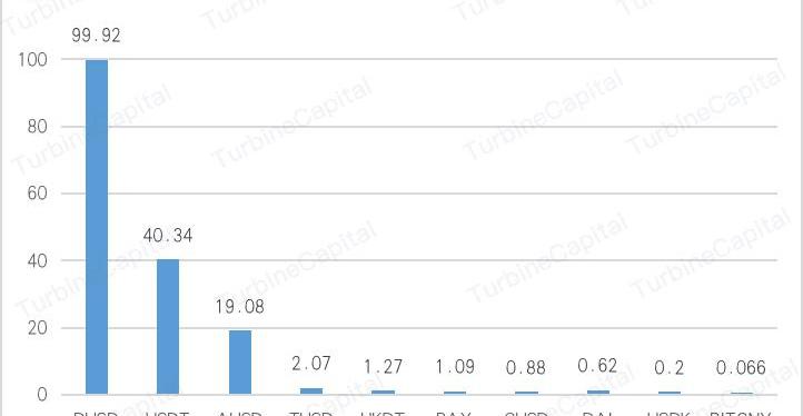 截止8月22日,可以看到,數字通證市場的總市值為2622.51億美元,其中BTC占據絕對主導地位,約68.5%,除BTC以外的數字貨幣市場總市值約為823.43億美元。我們以穩定幣種前10位為主流穩定幣來分析,則10個主流穩定幣的總市值達到了約165.54億美元,僅占數字通證市場的6.3%;而在這10個主流穩定幣中,DUSD的市值高達99.92億,占比約為60.36%,USDT列居第二位,市值約40.34億,還不到DUSD市值的一半,占比約24.37%,其余8個主流穩定幣的市值之和占比僅15.27%。其中,USDT從去年超過70%的占比下滑到如今的24%,終究還是因為其超發、濫發以及價值背書不透明引起暴雷事件頻發,導致投資者的信任程度下降。