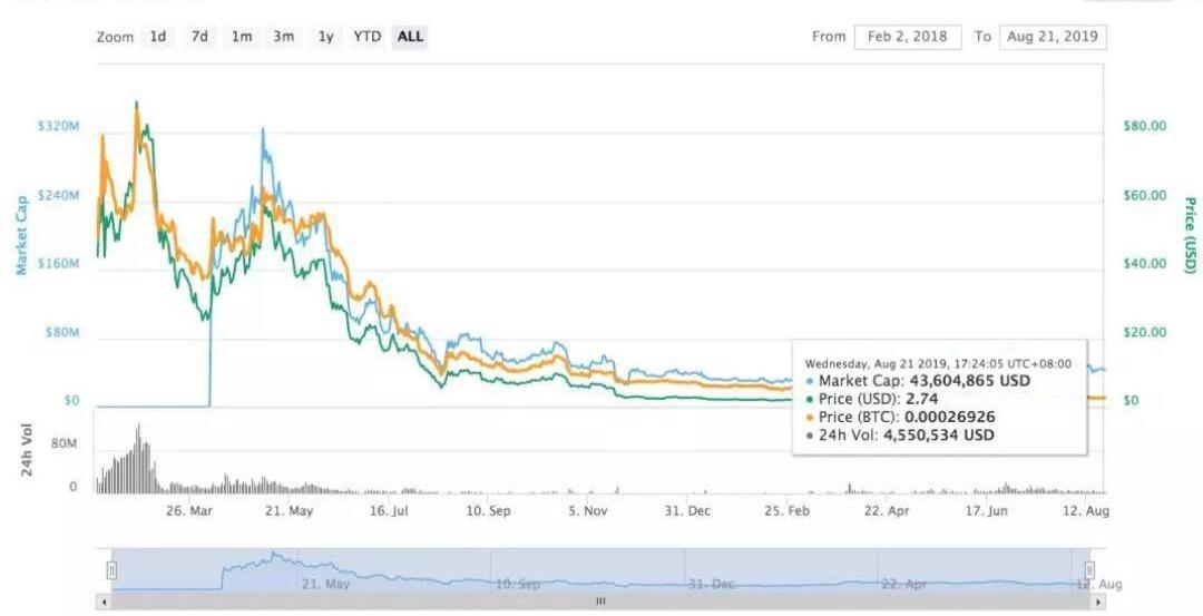 從非小號的數據上查看,ELA上線后確實有過一段輝煌,尤其是在2018年2月份中旬,到達了頂峰,最高觸及650元人民幣,不過時至今日,亦來云的價格僅有19元左右,整體跌幅接近97%。