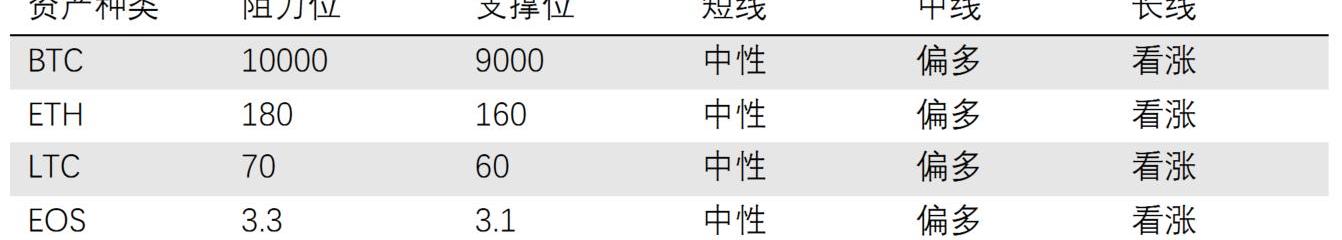 BTC長期趨勢向好,目前處于局部調整階段,瘋牛行情可能在未來一至兩年到來,可逢低加倉。智能合約平臺龍頭ETH、山寨幣龍頭LTC、DPoS龍頭EOS的BTC交易對接近年內低位,可逢低配置。