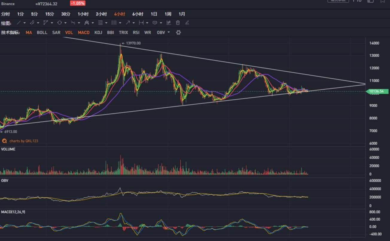 昨日早間BTC從10400美元開始下行,至10100美元附近橫盤調整,一直持續到今日,目前多空膠著并無明顯量能釋放。從4小時k線來看,BTC在日線收斂三角的下延地帶游走,MACD接近于零,短時繼續上行收斂或放量突破的可能性不減。