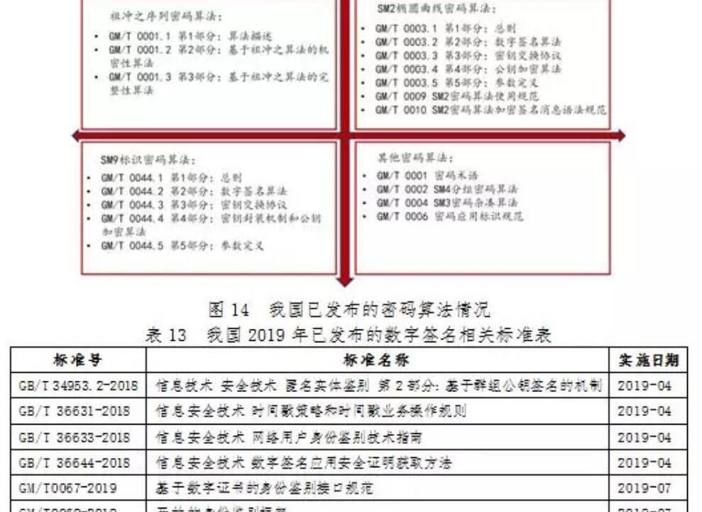 一是密碼算法和電子簽名標準體系相對完備。目前,我國已經建立較為完善的國產密碼算法體系,SM2橢圓密碼算法、SM3哈希密碼算法、SM9標識密碼算法和祖沖之密碼算法都可為區塊鏈技術提供核心支持。截至2019年6月,相關國密算法行業標準約有19項。2018年以前國內已頒布實施的數字簽名標準約有20項,國家市場監督管理總局、國家標準化管理委員會于2019年實施新批準發布的一系列標準,數字簽名標準也將更加完善。