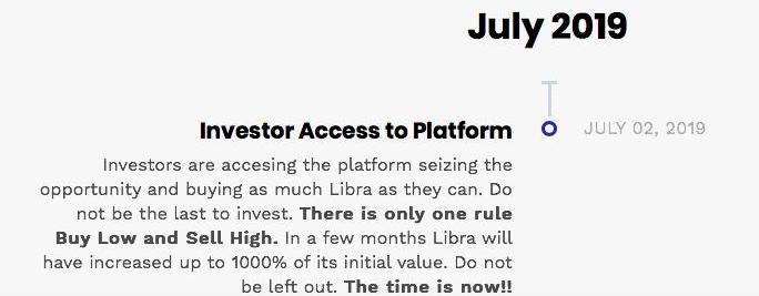 “投資者們正在進入該平臺,請抓住這個機會,盡你所能的購買Libra,不要做最后一個投資人,原則只有一條:低買高賣。Libra的估值將在幾個月后增長到1000%。別再落后了,時間到了!”