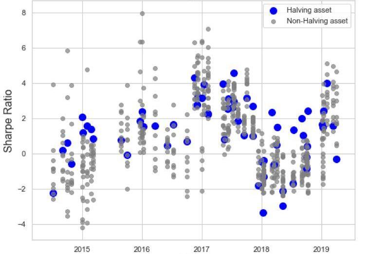 通過分析每種資產的時間序列并將其同該資產自身比較,可以發掘顯示減產事件對市場價格有限的進一步的證據。我們發現的情況是,一項資產在減產期間的回報率同非減產期間的回報率相比,在統計上來說,它們在99%的置信水平下在統計學上是相同的。換言之,我們并未發現減產導致價格的異常波動,而我們所面對的是一種間接的錯覺。