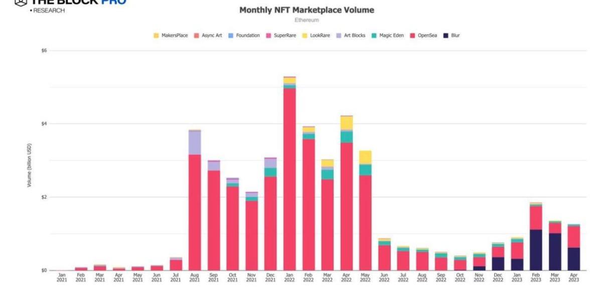 5、四月以太坊鏈上NFT市場交易額持續下降,減少至約12.7億美元,跌幅約為7.1%,新晉NFT市場Blur在月交易額等指標上已第三次超越OpenSea,不過OpenSea也在步步緊追,試圖縮小差距。