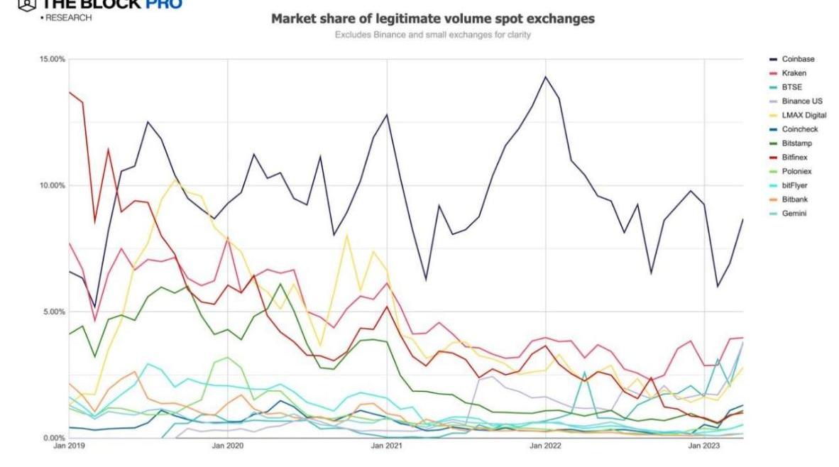 7、四月各大加密貨幣交易所的市場份額排名如下:幣安為71.6%、Coinbase為8.7%,Kraken為4%、BTSE為3.8%。