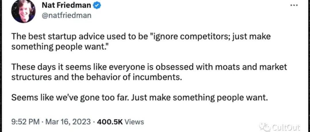 開發人們需要的東西是個好主意。只要開發出人們喜愛的產品,就不用擔心增長或護城河問題,誰用戶多誰就更成功。OpenAI首席執行官薩姆·奧特曼最近在推特上發表了這樣的觀點: