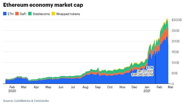 根據 Coinbase 的報告 The rise of the Ethereum economy 《以太坊經濟的崛起》中,統計了在以太坊網絡上衍生的各種加密經濟類型如 DeFi、穩定幣、wrapped tokens 以及 ETH 的總市值。如下圖,以太坊生態經濟市值已經超過 2500 億 美元 (沒有包括 NFT)。