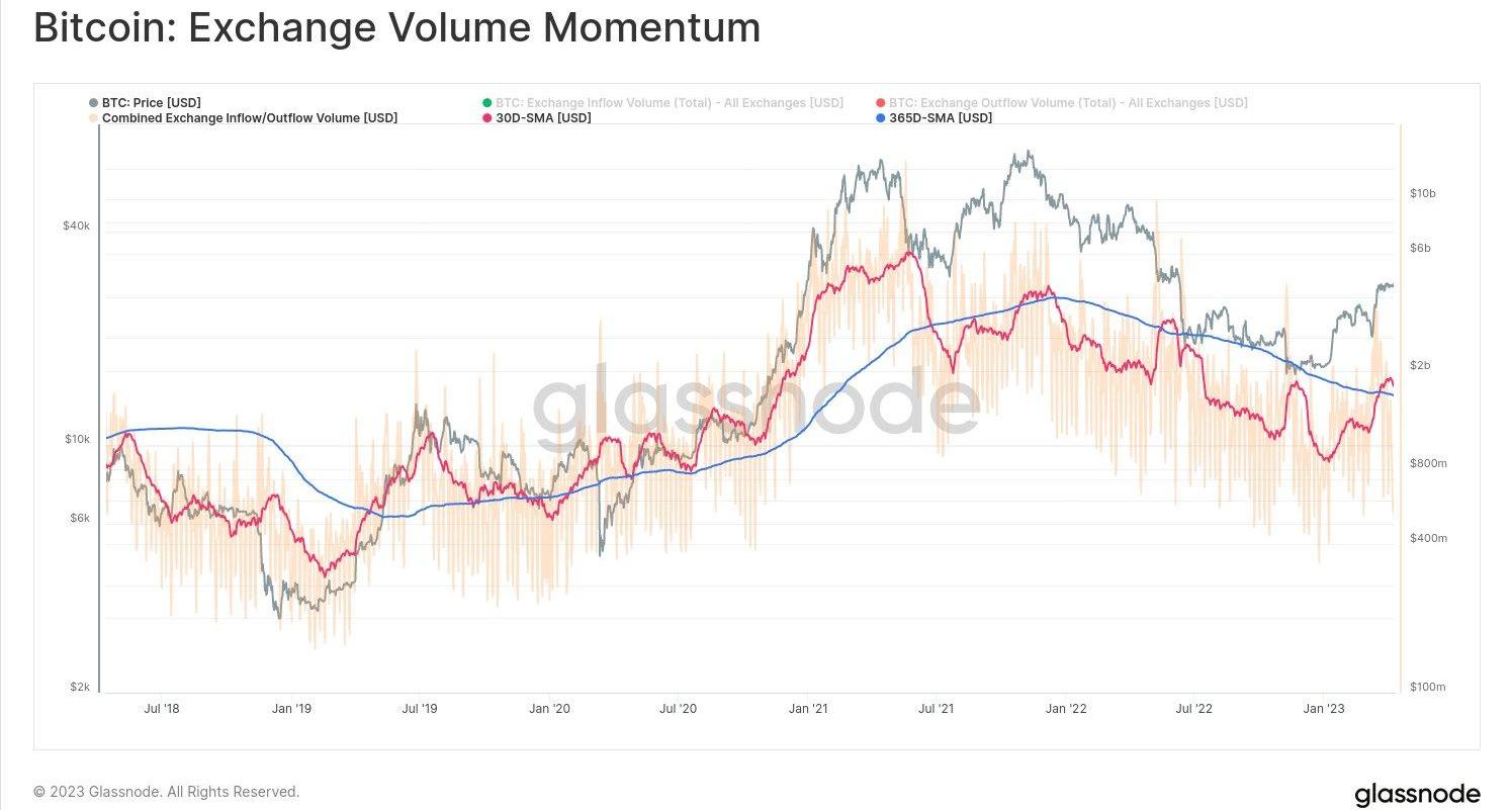 現貨驅動的比特幣市場往往會看到與交易相關的活動上升,BTC流入和流出都是為了交易。