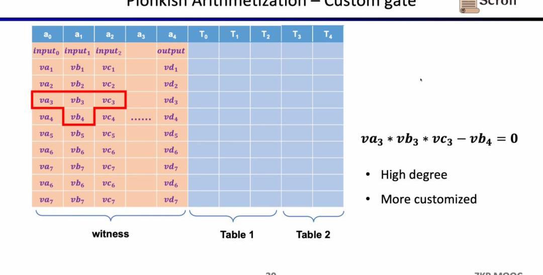第一種約束是自定義門,你可以定義不同單元格之間的多項式約束關系,例如va3*vb3*vc3-vb4=0。相比R1CS來說,階數可以更高,因為你可以定義任何一個變量的約束,并且可以定義一些非常不一樣的約束。