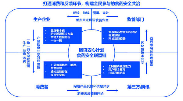 不僅如此,為了給企業搭建更加全面的品牌安全體系,騰訊還基于自身的區塊鏈能力,聯合第三方監管機構打造了騰訊安心計劃食藥安全聯盟鏈。聯盟鏈打通了監管機構、企業、消費者及第三方數據共享通路,實現產品從生產、入庫出庫、經銷商、終端店鋪到產品上架、消費者掃碼、物流等所有環節全流程追溯。通過為監管部門提供全流程數據服務,并結合騰訊安全大數據防偽、風險預警數據追蹤、反欺詐等AI技術,實現對食藥領域違法犯罪的精準打擊,進一步推動全鏈條監管制度的完善,更好維護企業與消費者利益。