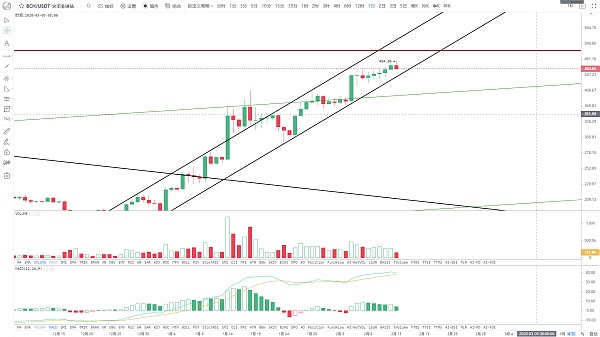 近期高點再次被刷新,價格保持向上試探,最高接近10500美元一線,遭到上方阻力壓制在小幅回落,成交量依舊沒有放量,也是短線未能延續漲勢的原因,日線指標上依舊保持強勢,價格仍位于一個上升通道內運行,從趨勢看很明顯多頭占據優勢,整體呈現一個震蕩上行的姿態,上方第一阻力區在前期13900美元下來的61.8%點位11000美元附近,不過目前小時線在形成一個楔形整理,短線回落的可能性大,只要不破趨勢支撐,回踩就是加倉做多的機會,后市仍有空間,支撐10000-10100美元區域。