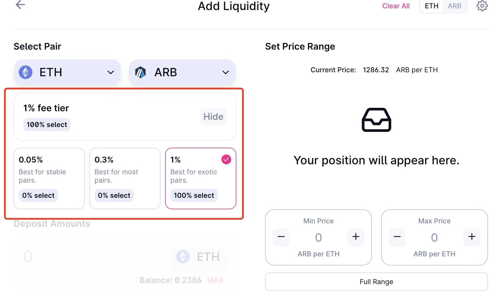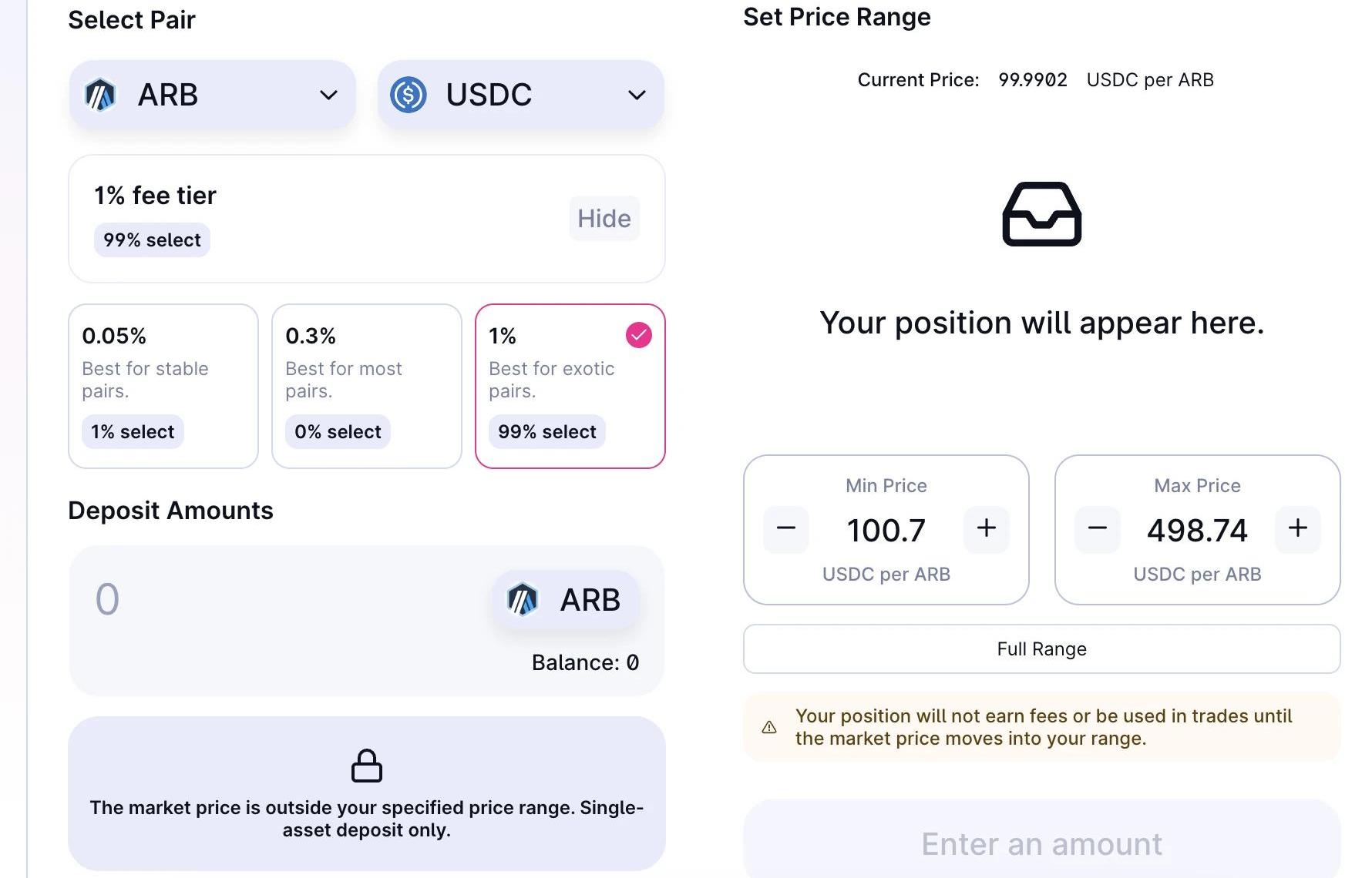 例如,將?ARB/USDC?做市區間設置為每?ARB?可兌換0.97?~?1.99USDC?之間,則當市場價格進入這一區間內時,我們即可向市場提供流動性并賺取費用。