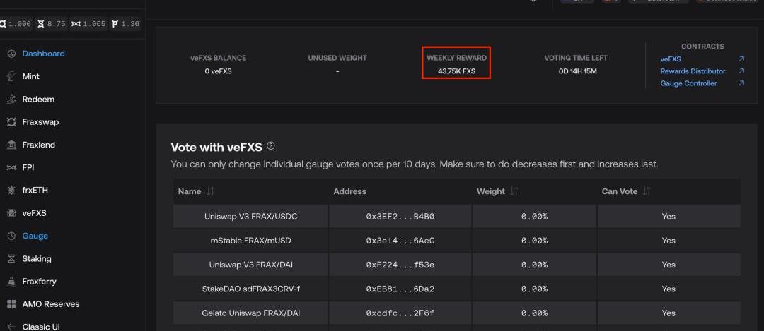 投票治理權:每個veFXS在治理提案中擁有1票投票權。