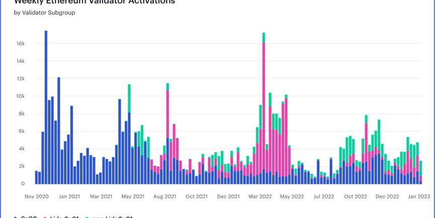 從圖2中可以看出,大約20%的新激活的驗證者仍然將他們的提款憑證設置為舊的0x00-類型。這可能是由于獨立質押者或機構使用過時的指南來激活驗證器,也可能質押者有意做出的決定,他們希望避免從部分提款中自動獲得流動資金的任何潛在稅收影響。請注意,在許多司法管轄區,質押的稅務影響還沒有明確的定義,這不是稅務建議。稅收規則因司法管轄區而異,應咨詢您所在司法管轄區的認證專業人員以獲得建議。