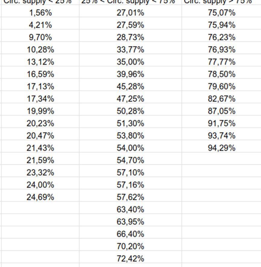 平均數:47%的循環/FDV比率中位數:50%的循環/FDV比率16個百倍幣的循環/FDV比率低于25%21個在25%和75%循環/FDV之間12個超過75%循環/FDV的人