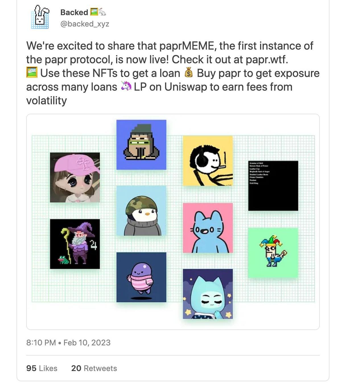 papr代幣為持有者和LP提供了一種低維護成本、"買入并持有"的方式,可以同時接觸到多個NFT收藏品和貸款,因為它以其基于反饋的價格增值系統的形式提供了潛在的利益。例如,第一個這樣的代幣,$paprMEME,提供了觸及10個NFT項目的貸款機會,包括CoolCats、ForgottenRunesWizard'sCult和Mfers。