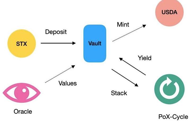 Arkadiko平臺的主要應用是抵押資產鑄造平臺的USDA穩定幣,模式與MakerDAO類似,用戶在Arkadiko的Vault中存入STX,通過超額抵押的方式,鑄造軟錨定于美元的穩定幣USDA,存入其中的STX還可以依靠Stacks的PoX機制獲得收益。除此之外,用戶還可以使用STX代幣作為交易和支付費用的工具,并通過抵押STX代幣來獲得借款,Arkadiko的借貸利率較低,對用戶而言非常有吸引力。另外,Arkadiko還提供了流動性池、穩定幣交易和收益農場等功能,讓用戶可以參與到更多的DeFi產品和服務中。同時,Arkadiko的開發團隊致力于提供更多的創新性DeFi產品和服務,為用戶提供更好的金融體驗。