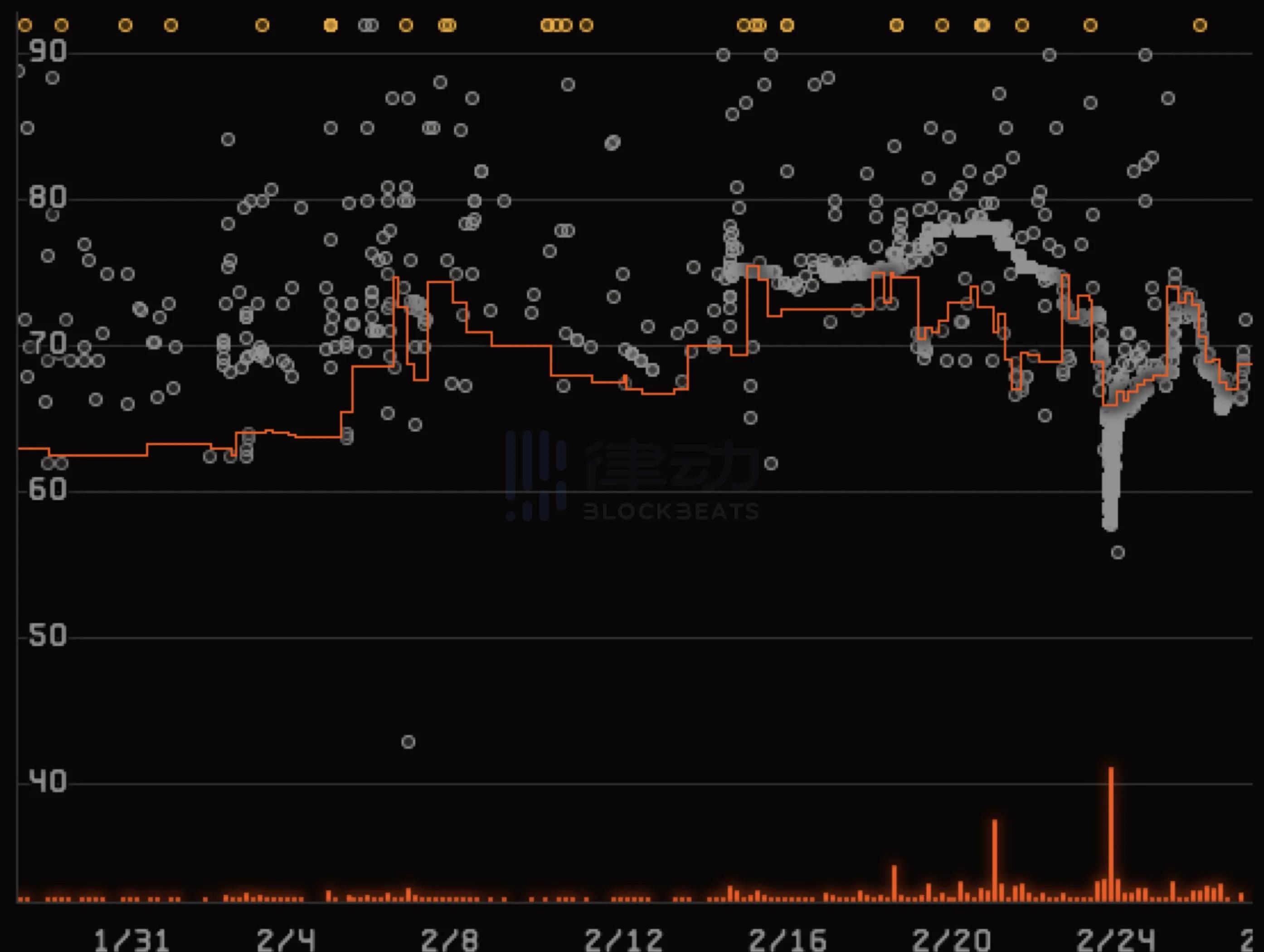 自2月初Blur空投積分進入白熱化階段后,我們的麻吉大哥就一直在掛出高價Bid,并緩慢抬升著BAYC的地板,一路上還零星接過了一些BAYC的賣單。但從Blur的交易圖表中可以看出,麻吉在這段時間并沒有投入太多的流動性。比如2月8日左右,BAYC的價格拉升至70ETH上方后,交易密度立刻變得很密集,但在這個價格附近的Bid墻不夠厚,于是地板又很快被砸了下來。