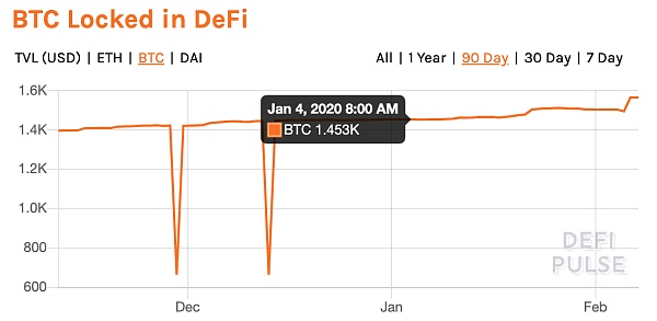 目前DeFi應用中鎖倉的BTC數量為1565枚,相比1月4日的1453枚增加了100枚BTC左右。
