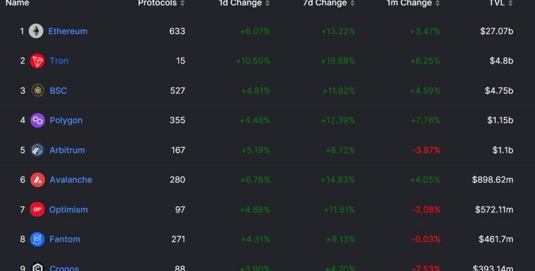 Optimism和Arbitrum在月度TVL變化中出現了明顯的負增長,另一方面,Polygon本月增長了7%。此外,Optimism的TVL幾乎是Arbitrum的一半,而Arbitrum和Polygon的TVL卻是相當的接近。