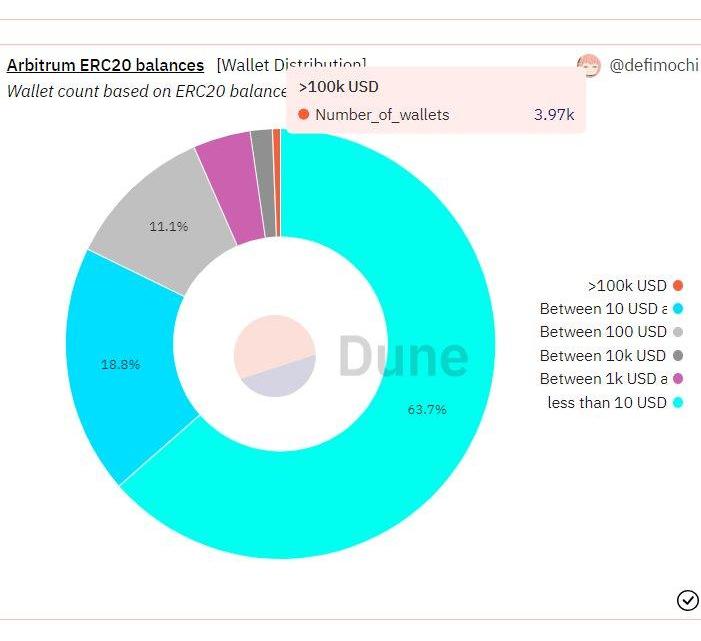 首先,Arbitrum上63%的錢包余額低于10美元。有趣的是,在所有的L2中,擁有10萬美元余額以上的錢包中占比最高的卻是Arbitrum。