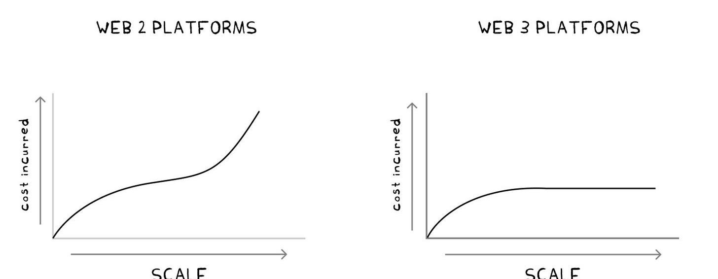 就像Uniswap這樣的Web3平臺而言,最初的成本是在代碼部署和審計方面。用戶承擔了向資金池增加流動性的成本。因此,隨著平臺的擴大,沒有邊際成本的增加。與區塊鏈相關的dApps是獨特的,因為無論發生多少百萬次交易,邊際成本往往保持平穩。