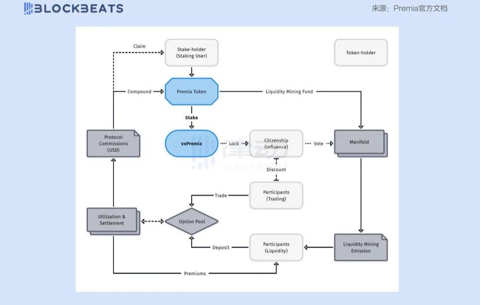 PREMIA是Premia的原生Token,與CRV類似,用戶通過鎖倉PREMIA以獲得vxPREMIA,并通過持有量和鎖倉時長增強自己的「影響力」。影響力的應用場景包括:增強流動性挖掘收益、疊加協議費用分配以及提升治理投票權重等。