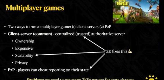 ZKP可以為他們的每一步動作提供可公開驗證的證明,向所有各方發出信號,表明該動作符合游戲規則。ZKP還可以用來證明游戲中數字資產的所有權,使服務器不再被需要。最后,ZKP可以解決游戲的擴容問題,因為可以將一些動作或行動集中在證明中驗證,減少計算成本,使更多的玩家能夠參與游戲。將零知識證明引入點對點游戲可能會使其成為元宇宙的一個核心概念,這些改進消除對昂貴的中心化服務器的需要,從而大大降低成本。這種改進使共享的虛擬空間中有更多的參與者,每個人都充當服務器,用公開驗證的ZKP驗證其他玩家的行動。