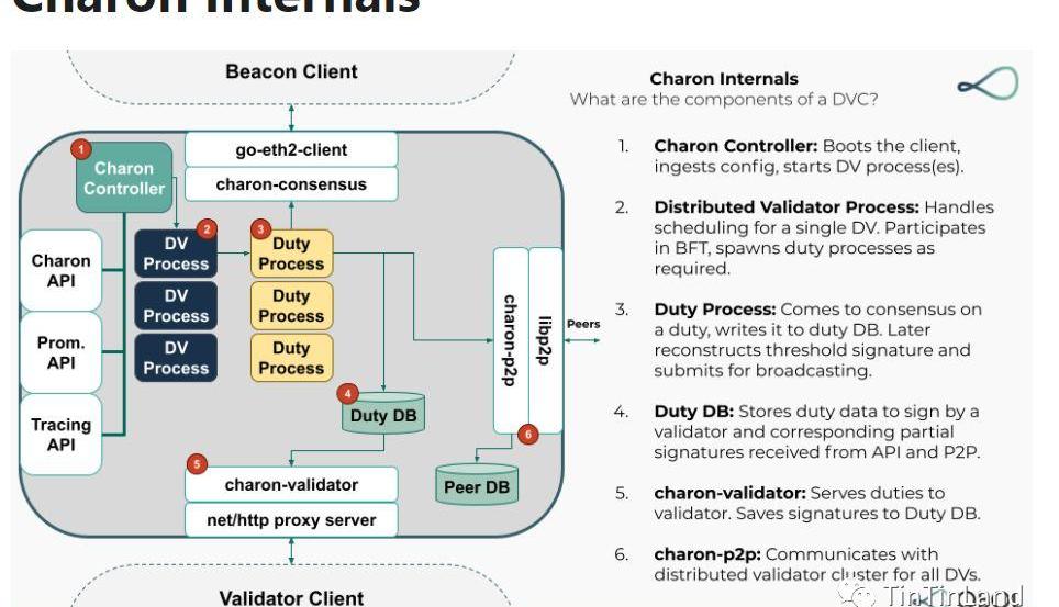 ObolNetwork推出了插件客戶端Charon來啟用DVT,能夠以容錯的分布式方式運行。通過調整DVT技術,Obol引入主動-主動冗余來解決運行主動-被動系統的缺點。驗證器不是在一臺機器上運行,而是在多臺機器上運行以創建容錯,承受部分節點故障。通過溝通并達成共識,多個Charon客戶端一起行動,模擬一個統一的驗證者。在這一過程中,Charon使驗證器得以任何支持信標鏈標準的HTTPAPI的客戶端,并能夠維護現有的遠程簽名基礎設施。所以,對于驗證者而言,Charon提供了更輕松的采用途徑。