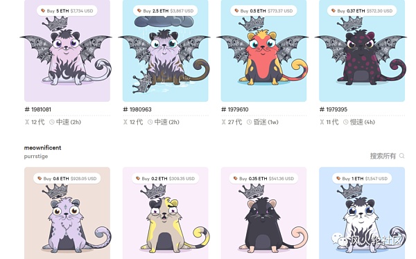 1. 游戲,這里著名的一個實例是加密貓,它和我們后面要提到的flow也有些淵源,加密貓曾在2017年的牛市爆火,在它上面可以用eth來買不同品種的虛擬貓,飼養繁殖交易,運氣好的玩家可以靠繁殖出稀有品種出售來賺錢。