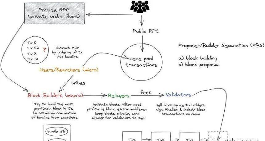 當一個用戶發起一筆交易時,首先會進入公共內存池,如果這是一筆普通的交易,那就會在等待一段時間之后被區塊構建者放入其創造的區塊中、如果這是一筆被搜索者盯上的交易,就會以捆綁包的形式進入區塊中。再經過中繼層、最終被區塊提議者簽署證明并將其廣播到網絡。用戶也可以使用區塊構建者的私人節點,從而避開公共內存池。