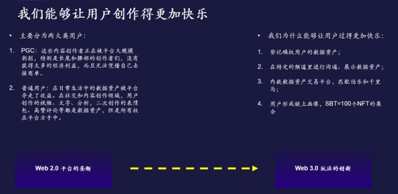 3.Web2社交場景內部的流派比較:DID?派通過聚合數據、然后利用數據讓消費者獲益,從而更加Web3原生。而創新場景相當于是通過一個新穎、獵奇的場景來吸引用戶,然后再沉淀用戶的數據資產。兩個用戶的切入思路。